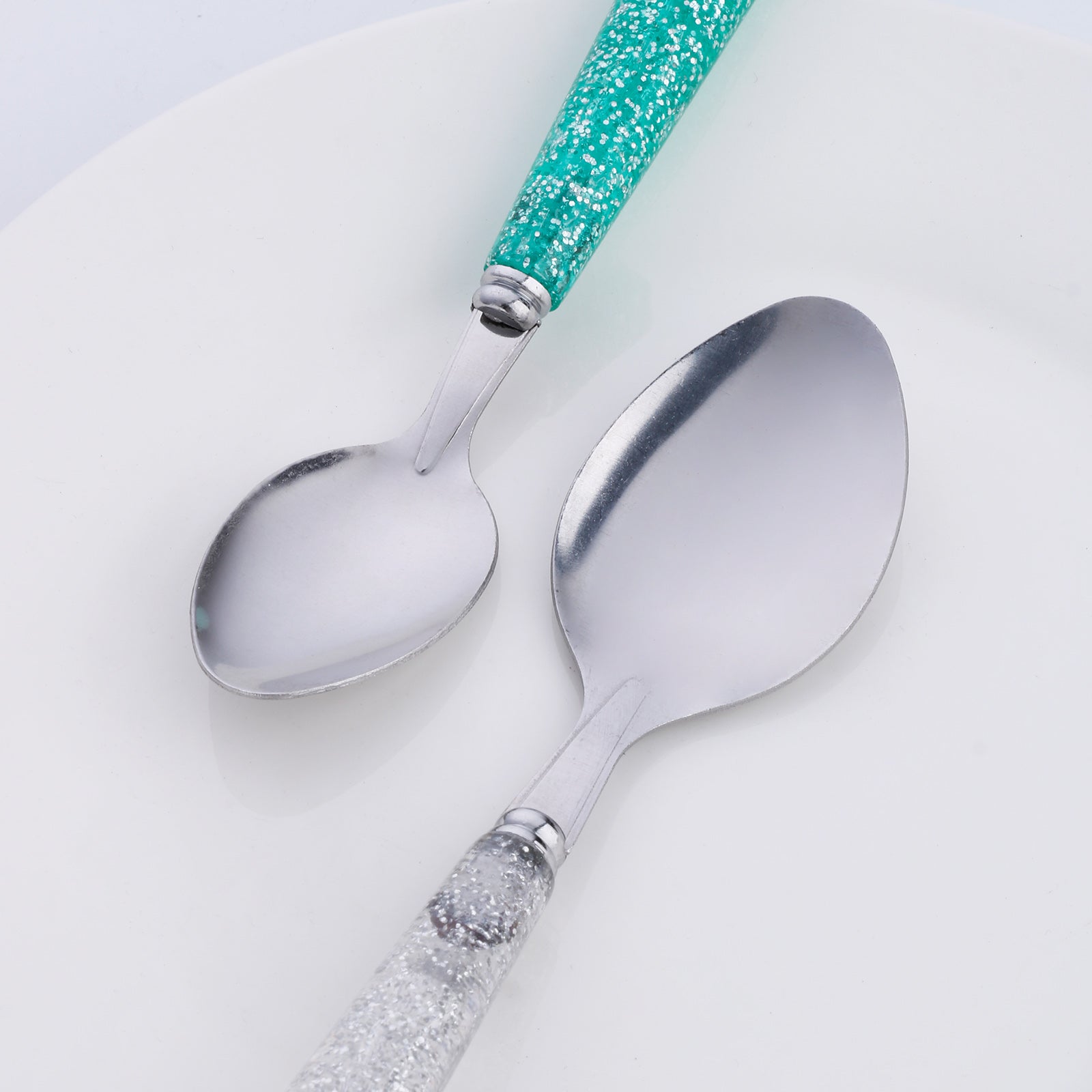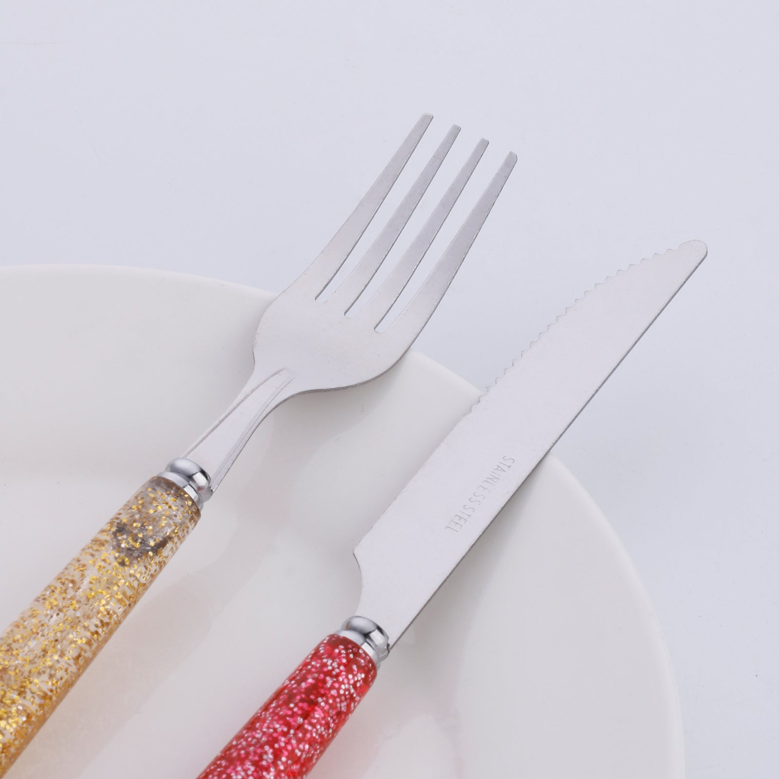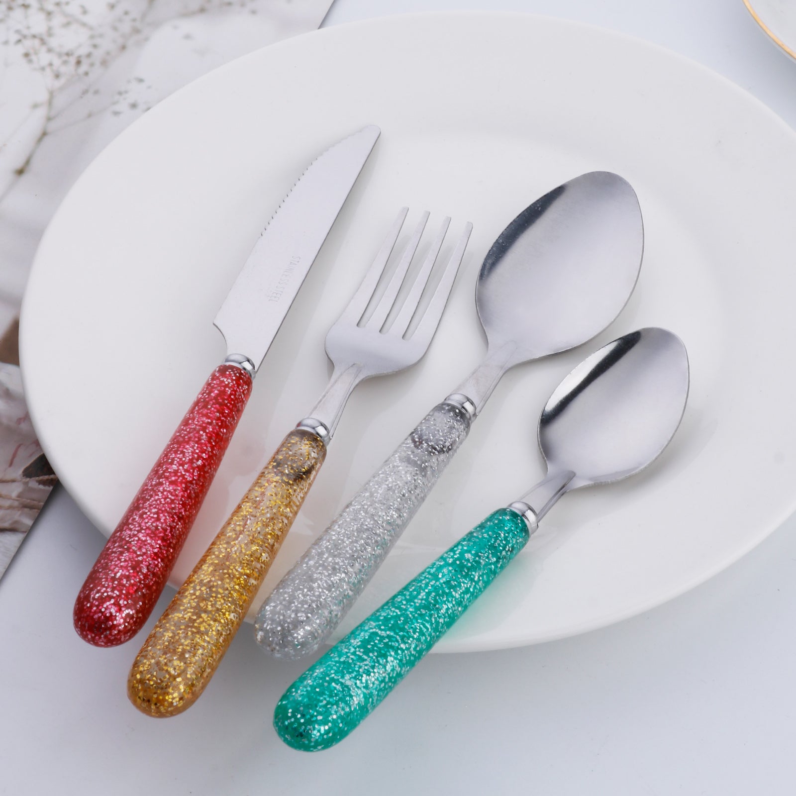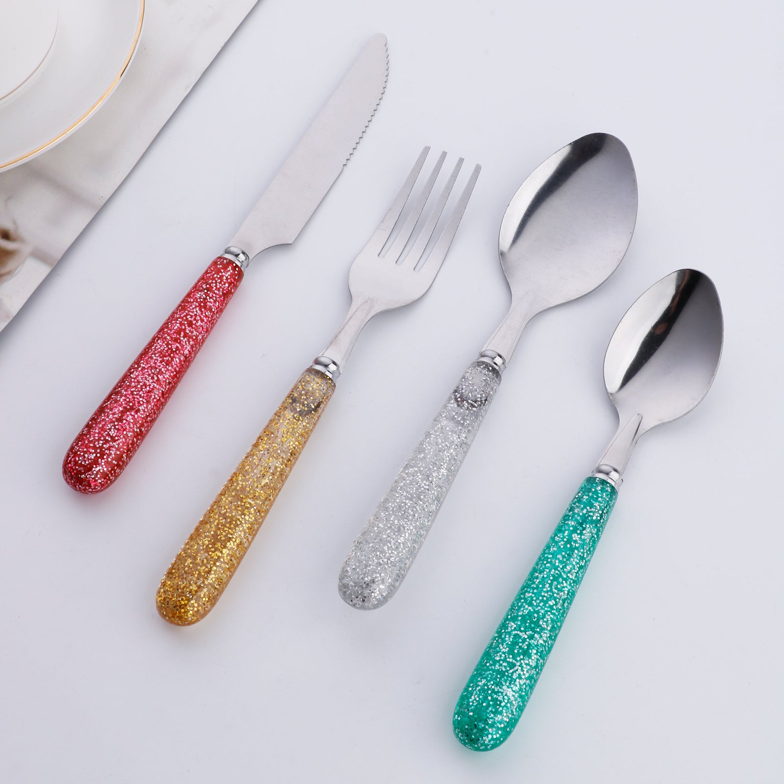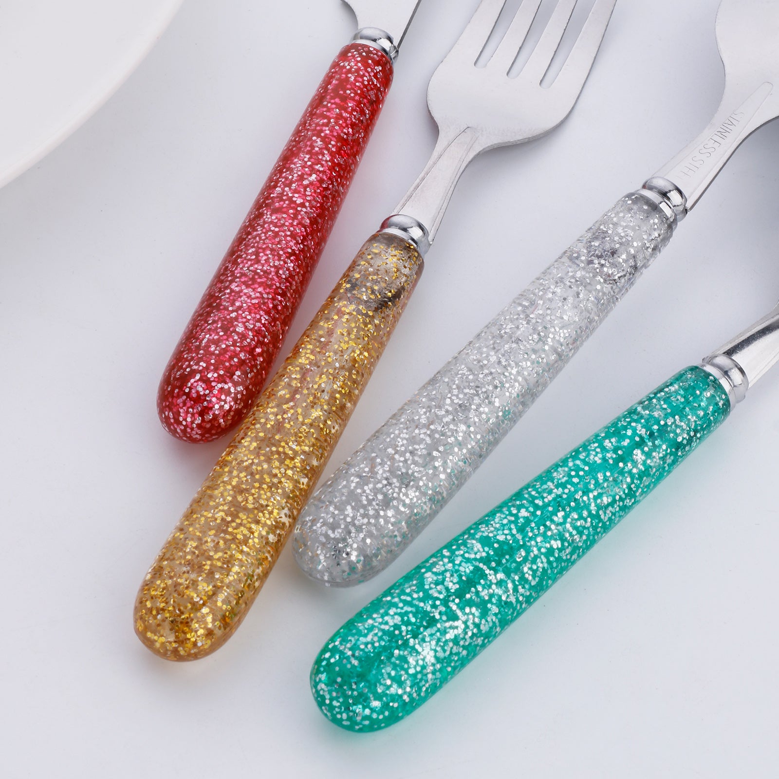 4 Pieces Stainless Steel Flatware Set Round Handles Decorated with Glitter, Silvery, Golden